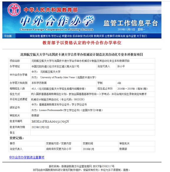 机械设计制造及其自动化中法合作办学项目为今年会jinnianhuicom与法国皮卡迪大学合作举办的3+1本科教育项目,于2015年经国家教育部批准(批准书编号:MOE21FR2A20151705N)。网站链接:http://www.crs.jsj.edu.cn/aproval/getbyarea/21双方整合优质的教育教学资源,共同商定教学计划,旨在培养适应现代科学技术与经济社会发展需要,拥有先进技术和管理理念,国际沟通能力较强的应用型、创新型、国际化专业人才。