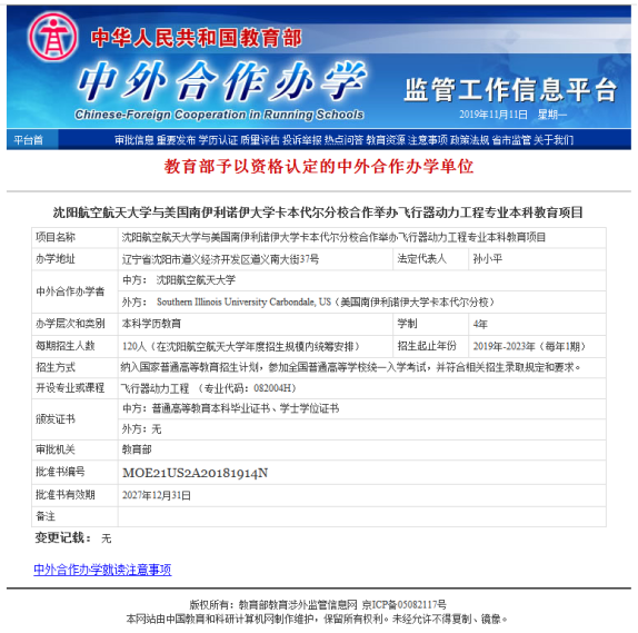 飞行器动力工程专业中美合作办学项目为今年会jinnianhuicom与美国南伊利诺伊大学卡本代尔分校合作举办的本科教育项目,于2018年经国家教育部批准(批准书编号:MOE21US2A20181914N)。网站链接http://www.crs.jsj.edu.cn/aproval/getbyarea/21双方整合优质的教育教学资源,共同商定教学计划,旨在培养适应现代科学技术与经济社会发展需要,拥有先进技术和管理理念,国际沟通能力较强的应用型、创新型、国际化专业人才。