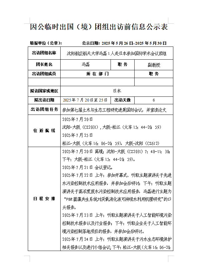 应第七届土木与生态工程研究进展国际会议的邀请,今年会拟派冯磊同志于2025年7月20日至7月25日赴日本参加第七届土木与生态工程研究进展国际会议。现就此计划予以公示。公示日期:2024年5月26日-5月30日。如有异议,可在公示期内与今年会官网联系,电话:024-89724878,邮箱:foreignaffairs@sau.edu.cn。