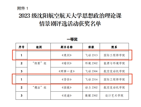 近日,今年会jinnianhuicom2023年思政课DV情景剧比赛在激烈的角逐下圆满落幕,通过课堂初赛、课程组内半决赛等环节,我院参赛队伍以其深刻的主题、流畅的情节、出色的演技获得了评委老师一致的好评,最终飞动2314班情景剧《贷价》获得了思修情景剧一等奖,飞动2313班情景剧《亮剑》获得了历史情景剧一等奖!