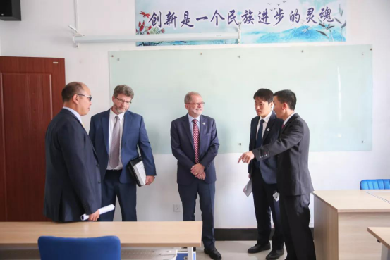揭牌仪式结束后,孙小平陪同Dr. John M. Dun校长一行参观了通用航空研究院、飞机装配大厅,向来访嘉宾介绍了沈航在自主创新研发等领域取得的成绩。随后参观了刚刚装饰一新的国际工程师学院。看到学院崭新的教学设施、独特的文化建设以及师生们振奋昂扬的精神风貌,两位校长对联合办学项目充满了信心,双方均表示将共同努力把两校之间的合作提升到新的高度。