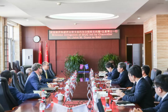 孙小平向Dr. John M. Dun校长一行的来访致以热烈的欢迎,并介绍了今年会的办学历史、学校建设进展、优势学科和国际合作情况等。Dr. John M. Dun校长介绍了南伊利诺伊卡本代尔分校的发展历史、航空优势专业在美国的领先地位等。双方就进一步加深飞行器动力专业合作办学项目进行了交流和商讨。会谈中,双方期待在学生交流与学科研究方面开展合作,实现两校合作共赢的愿景。